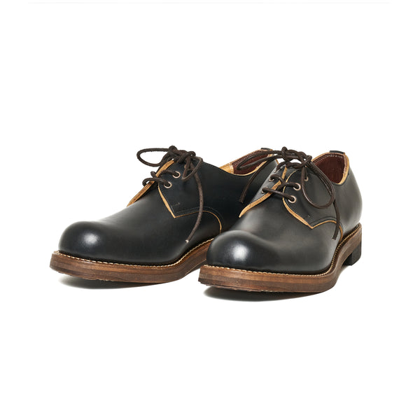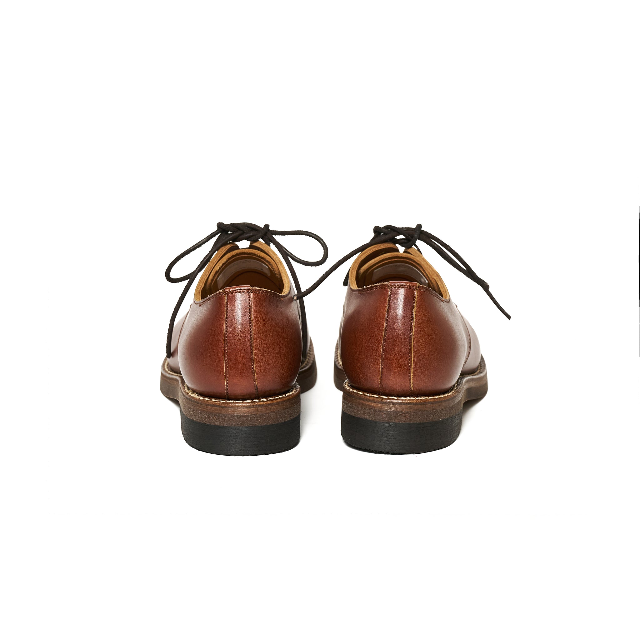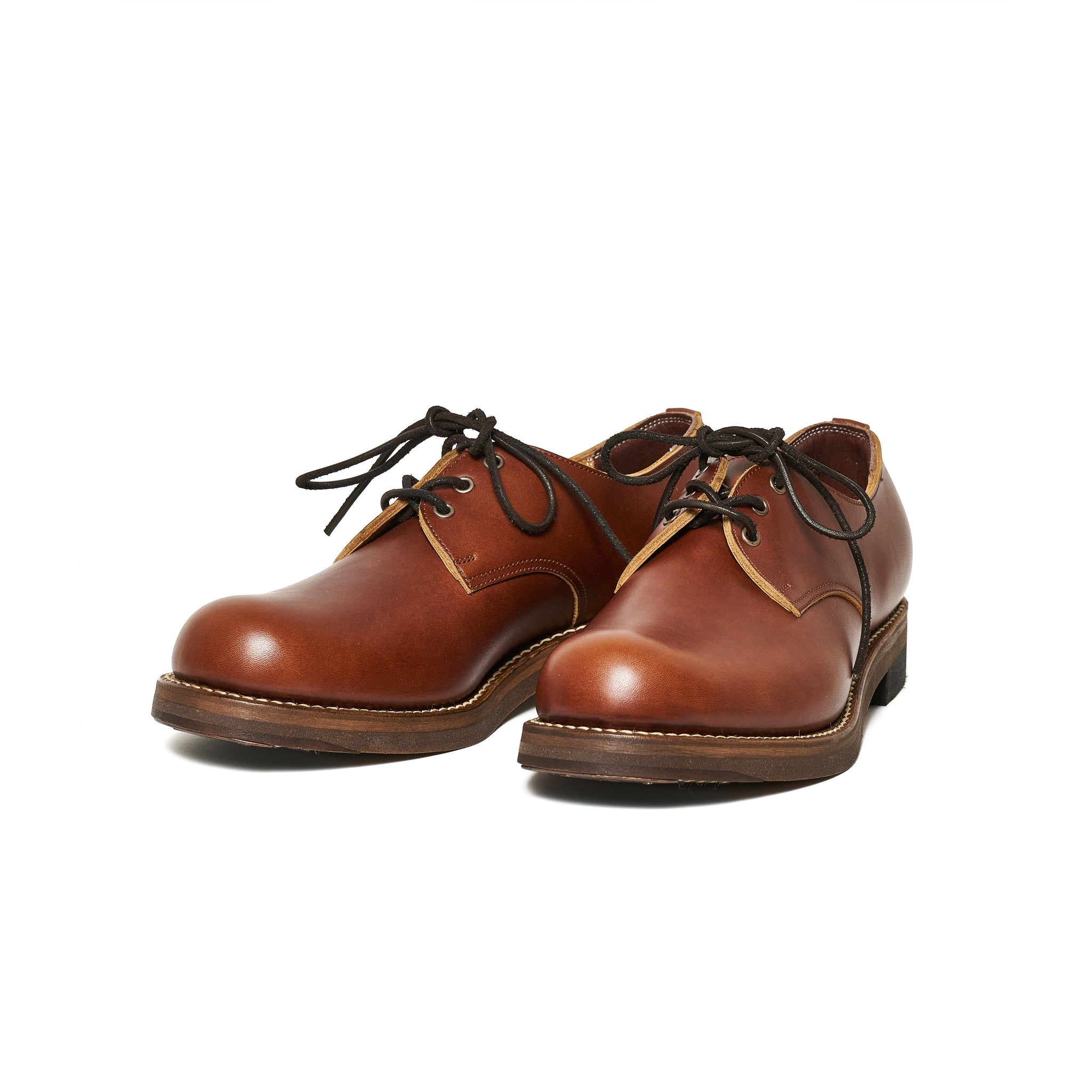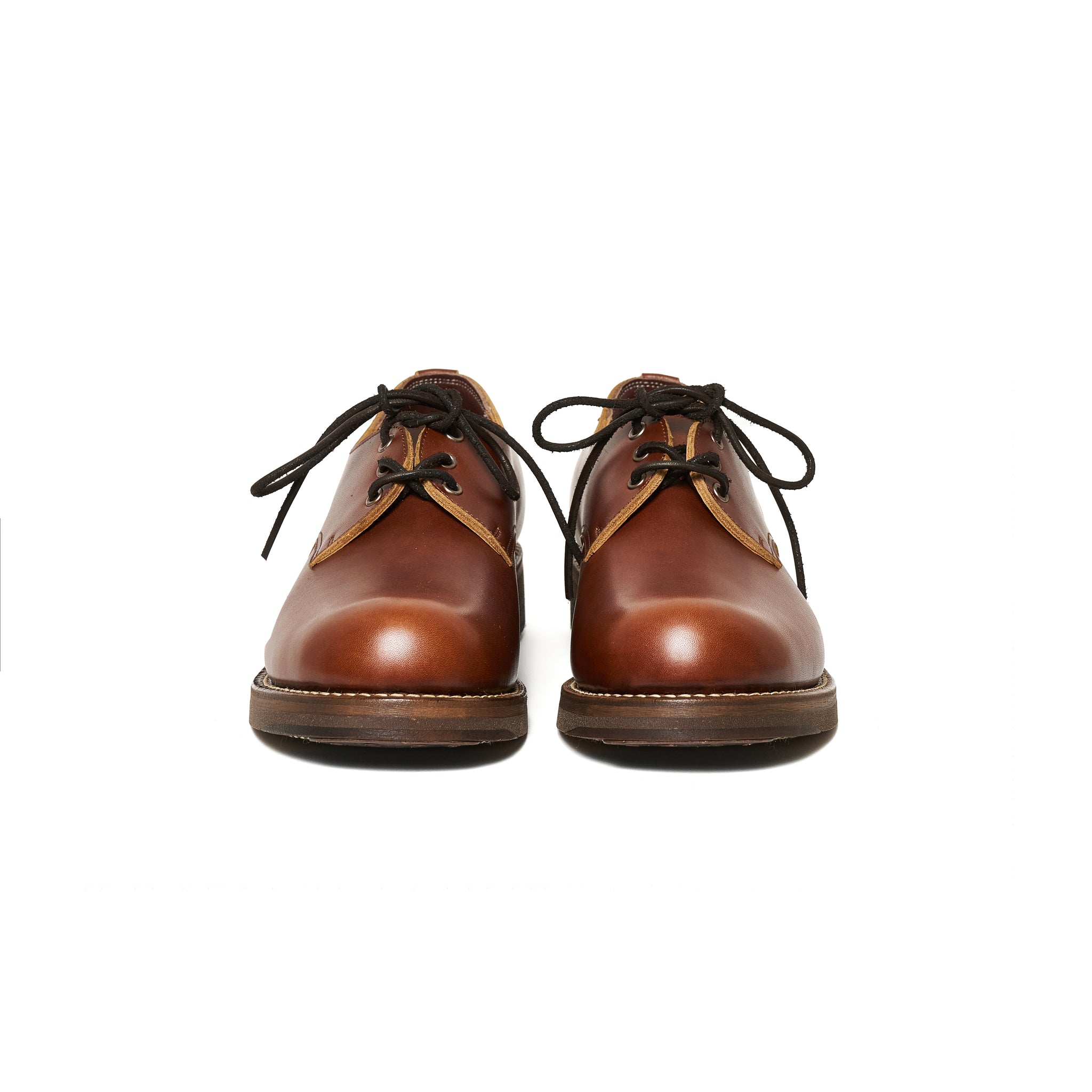 Low-cut shoes with fewer eyelets are often designed with elegance in mind rather than foot hold or practicality. However, this model is crafted from thick French kip leather and shaped with a substantial, well-balanced form. Paired with our original cork sole, it carries a robust presence reminiscent of a sturdy boot.