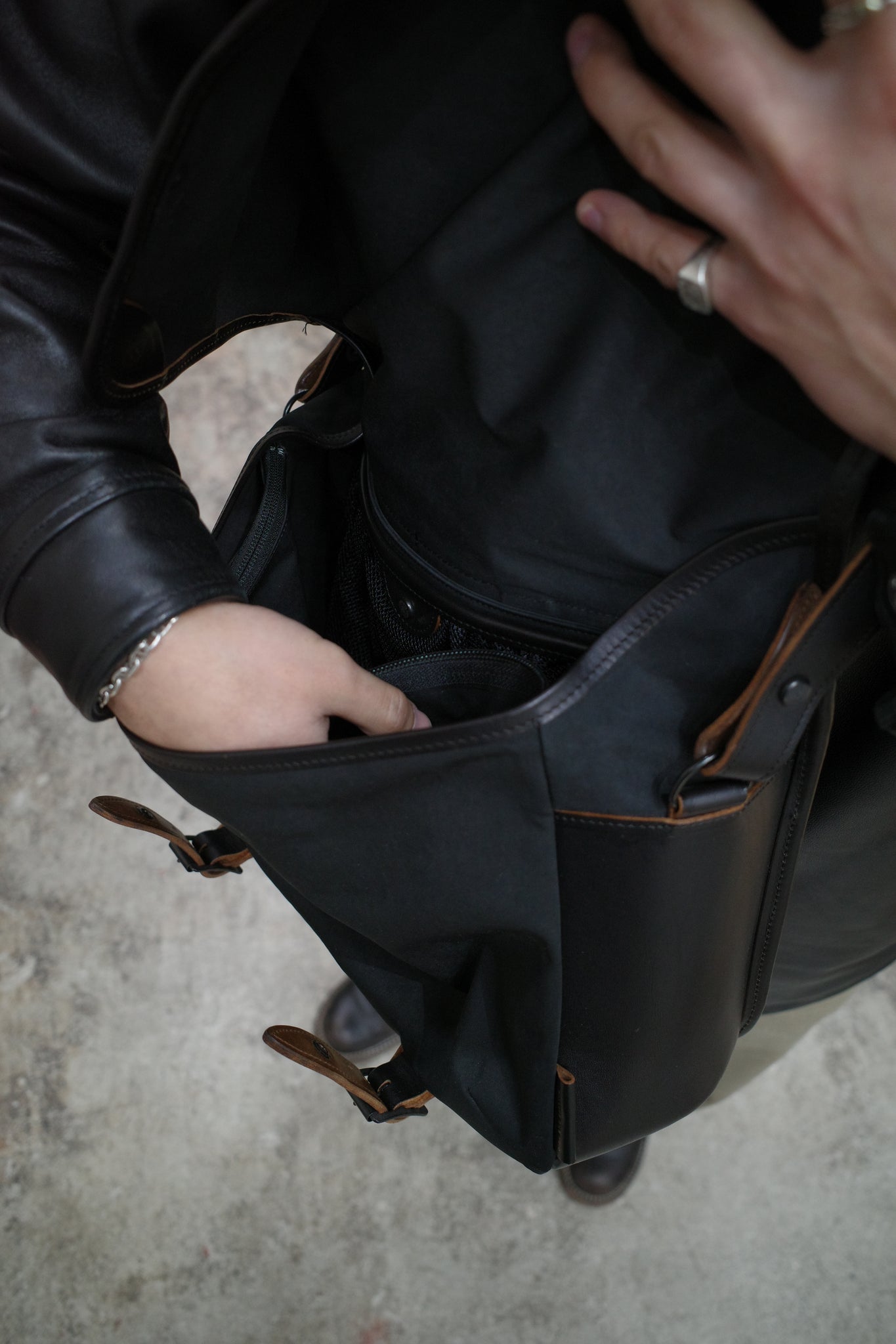 高密度ミリクロスとオイルドバケッタレザーを使用した容量9Lのショルダーバッグ。